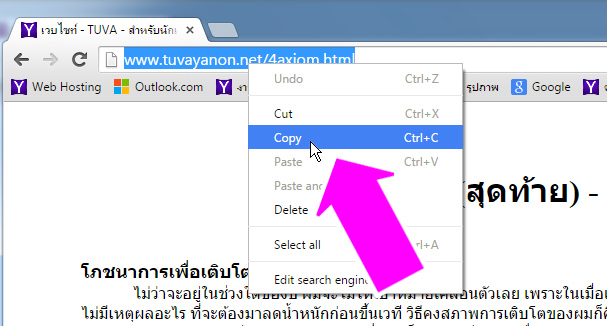 ( ภาพบน ) ให้เลือกไปที่คำสั่ง Copy ตรงที่ ลูกศรสีม่วง ชี้อยู่ในภาพข้างบน |