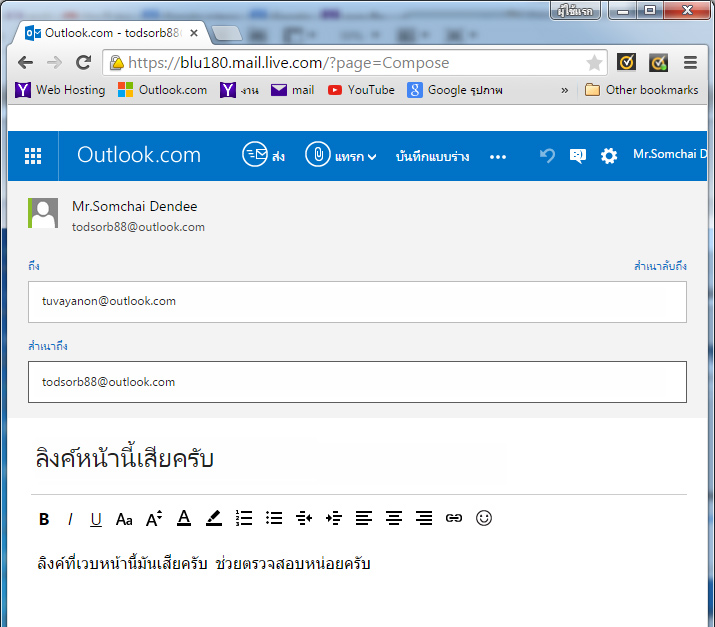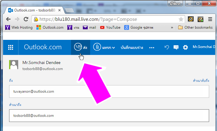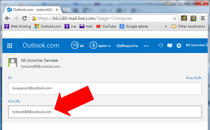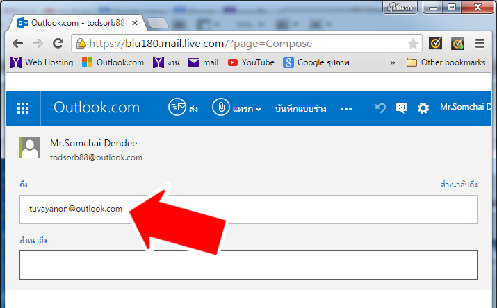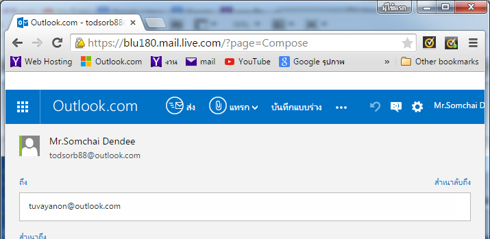 ผม สมมติ ให้คุณผู้อ่านชื่อ คุณสมชาย เด่นดี ( Mr.Somchai Dendee ) และคุณใช้อีเมลล์ชื่อ todsorb88@outlook.com นะครับ / ที่ต้องสมมติ ก็เพื่อจะได้อธิบายได้ง่ายขึ้นนะครับ ภารกิจของคุณ ( คุณคือ Mr.Somchai Dendee ) ก็คือว่า คุณจะต้องส่งเมลล์มาให้ผม ที่ tuvayanon@outlook.com นะครับ มาเริ่มต้นกันเลยครับ |