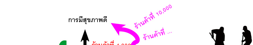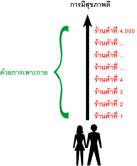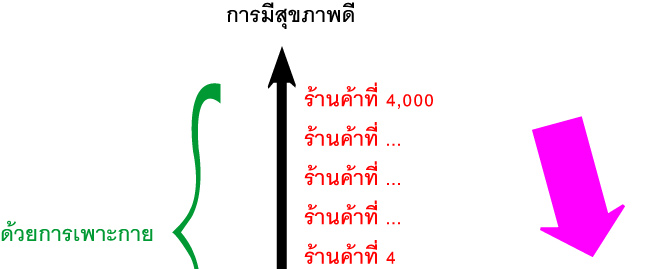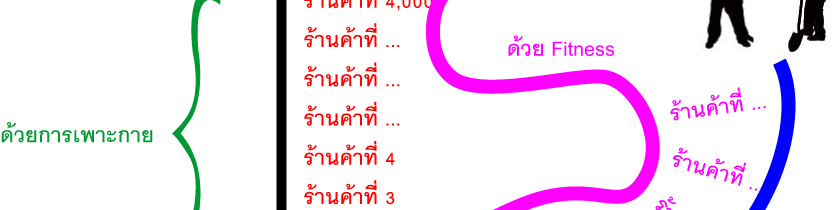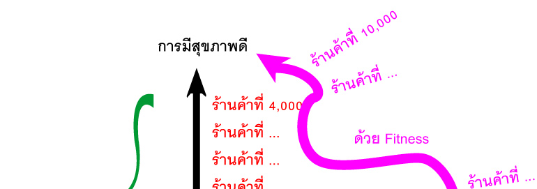 จึงมีแฟชั่นสำหรับนักเพาะกายหญิงออกมาเยอะมาก ) ในภาพข้างบน ผมเขียนไว้บนสุดว่า เป็นร้านค้าที่ 4,000 ก็หมายถึงว่าผม "สมมติ" ว่ามีการ แตกไลน์สินค้าที่จับต้องได้ ( เช่น อาหารเสริม ,อุปกรณ์ ) ,แตกไลน์สินค้าที่จับต้องไม่ได้ ( เช่น บริการเทรนเนอร์ส่วนตัว ,บริการนวดให้นักเพาะกาย ) ,แตกไลน์สินค้าแบบเดียวกัน แต่แยกเป็นบริษัท ( เช่น เวย์โปรตีนเหมือนกัน แต่ก็จะมีบริษัท มัสเซิลเทค ,บริษัทไดมาไทซ์ ,บริษัท GNC ที่ทำเวย์มาเหมือนๆกัน ) / คือหมายความว่า จากการรวมทุกการแตกไลน์ที่ว่ามานี้ ผมสมมติว่า ให้เป็นการแตกไลน์ 4,000 รูปแบบ ( คือแทนด้วยคำว่า มีร้านค้า 4,000 ร้านแล้ว ) |
