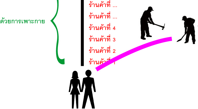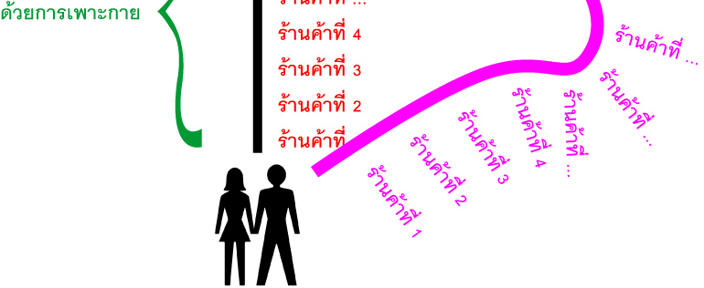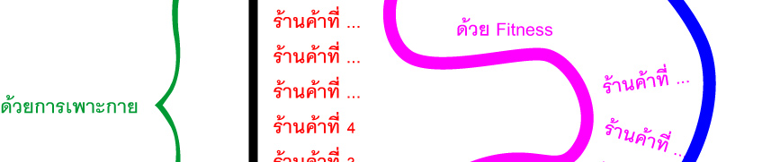 อันนี้ผมอธิบายแบบเป็นนามธรรมนะครับ อย่างง ) คำว่า "เอาสินค้าเกี่ยวกับการเพาะกายมาขาย" ก็หมายถึงว่า ( ดูในรูปบนนะครับ ) ร้านค้าที่ 1 ก็เป็นการเปิดโรงยิมให้บริการแบบเก็บเงิน / ร้านค้าที่ 2 ก็เป็นการขายอุปกรณ์เพาะกาย / ร้านค้าที่ 3 ก็เป็นการขายอาหารเสริมสำหรับเพาะกาย / ร้านค้าที่ 4 ก็เป็นการขายเสื้อผ้าสำหรับนักเพาะกายโดยเฉพาะ ( เพราะใส่ขนาดเดียวกับคนทั่วไปไม่ได้ ) |