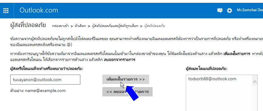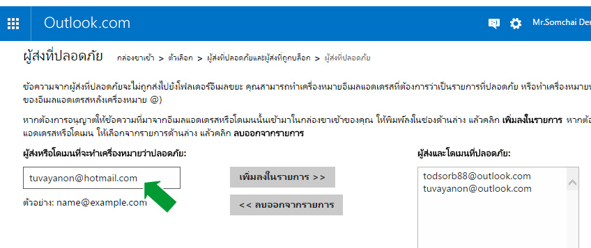 tuvayanon@outlook.com ได้เข้ามาอยู่ตรงที่ ลูกศรสีแดง ชี้อยู่ในภาพข้างบนนี้ เรียบร้อยแล้ว |