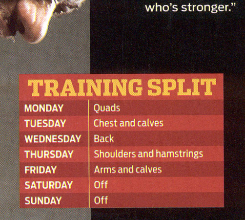 ) มาดูเรื่องตารางฝึกของเขากันก่อนครับ มาจากนิตยสารเฟล็ก ฉบับเดือน กันยายน 2552 ซึ่งเหลือเพียง 1 เดือนก็จะต้องขึ้นประกวดมิสเตอร์โอลิมเปียแล้ว ( ประกวดเดือนตุลาคม 2552 ) |