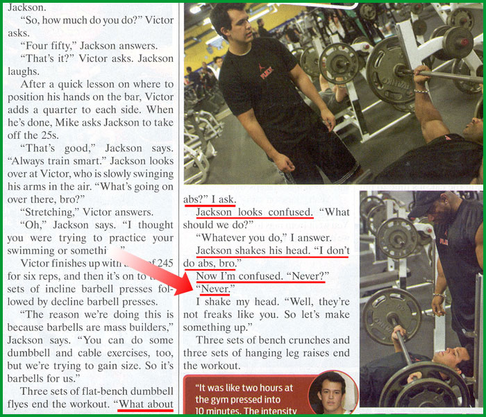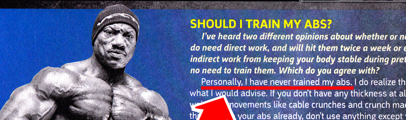 แทนที่จะแสกนเอามาเฉพาะส่วนที่ต้องการให้อ่านอย่างเดียว คือว่าบทความที่ผมเอามาให้อ่านนี้ เกี่ยวกับวาระพิเศษ ที่ให้คนสนใจส่งคูปองไปชิงโชค แล้วทางนิตยสารเพาะกาย ก็จะจับฉลาก ใครโชคดี ก็จะมีนักเพาะกายซูเปอร์สตาร์ก็จะไปหาคนนั้นที่บ้าน แล้วชวนไปกินข้าว โดยบทสนทนานี้คือคำพูดระหว่างคุณวิคเตอร์ ( ผู้โชคดี ) กับคุณแจ็คสัน ( นักเพาะกายในภาพข้างบนนี้นั่นเอง ) ที่พากันออกมาทานข้าว ,ซื้อของ เสร็จแล้วก็พากันมาออกกำลัง แล้วผมก็ตัดส่วนที่เป็นบทสนทนาตอนที่ในโรงยิมมาให้อ่านนี้ หลังจากบริหารท่า Flat bench dumbbell flyes อันเป็นท่าจบสำหรับการบริหารหน้าอกแล้ว วิคเตอร์ก็ถามแจ็คสันว่า เราจะบริหารอะไรต่อล่ะ ,แจ็คสัน งง ( ทำนองว่าทำไมจะต้องบริหารต่อหรือ? ) ,ตอนนี้ คิดว่าวิคเตอร์ กำลังรอให้แจ็คสันคิดได้ว่าน่าจะต้องบริหารกล้ามท้องต่อ เพราะคนทั่วไปก็มักจะบริหารกล้ามท้องเป็นท่าสุดท้ายก่อนจบการบริหารในแต่ละวัน ,แจ็คสัน คงจะพึ่งคิดออก เลยบอกออกมาชัดเจนเลยว่า "ผมไม่เล่นกล้ามท้อง" ,วิคเตอร์งง จนต้องถามซ้ำว่า ไม่เคยเล่นกล้ามท้องเลยเหรอ? ,แจ็คสัน ย้ำอีกที "ไม่เคย" ( Never ) วิเคราะห์ 1.แจ็คสันบอกว่า don't do abs ก็คือไม่เล่นกล้ามท้องเลย ไม่ได้บอกว่า ไม่เล่นกล้ามท้องหลังการเล่นกล้ามหน้าอก ,หรือว่าไม่เล่นกล้ามท้องในช่วงเวลานี้ นะครับ 2.คำว่า Never ของแจ็คสันนั้น ก็หมายความว่าเขาไม่เล่นกล้ามท้องเลย ไม่ว่าจะเป็นช่วงไหนก็ตาม ( หมายความว่า แม้จะเป็นช่วงนอกฤดูแข่งขัน หรือช่วงเตรียมตัวประกวด เขาก็ไม่เล่นกล้ามท้องเลย ) ไม่ว่ารูปแบบ "ความเชื่อ" เกี่ยวกับกล้ามท้องก่อนหน้านี้ของคุณจะเป็นอย่างไร แต่สิ่งที่ผมแสดงให้คุณเห็นเกี่ยวกับนักเพาะกายผู้นี้ ( เด็กเธอร์ แจ็คสัน ) เป็น "ข้อเท็จจริง" ก็ลองชั่งน้ำหนักดูระหว่าง แค่ "ความเชื่อ" กับ "ข้อเท็จจริง" ก็คงจะรู้นะครับว่าอันไหนน่าสนับสนุนมากกว่า ก็ต้องเป็นตัว "ข้อเท็จจริง" อยู่แล้ว |