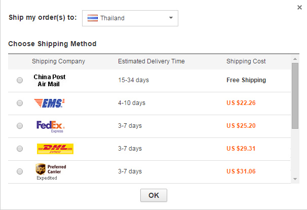 การส่ง EMS ที่ Aliexpress เป็นอันขาดน่ะครับ เกริ่นนำนิดนึงก่อนครับ คือว่า เวลาที่เรา ( ที่อยู่ในประเทศไทย ) จะส่งพัสดุไปให้เพื่อนที่อยู่ในประเทศไทยด้วยกันนั้น ถ้าเป็นการส่งแบบธรรมดา ( ไม่ใช่แบบ EMS ) พัสดุนั้นกว่าจะถึงมือเพื่อน ก็กินเวลานานมาก มิหนำซ้ำยังเช็คสถานะ ( Tracking ) ไม่ได้ด้วยว่าพัสดุอยู่ที่ไหนแล้ว จะหายไปไหนหรือเปล่า / แต่พอเราเลือกการส่งเป็นแบบ EMS พัสดุนั้นก็จะถึงมือเพื่อนของเราเร็วขึ้น และยังระหว่างที่รอการเดินทางของพัสดุ เราก็ยังเช็คสถานะได้ด้วยว่าตอนนี้ พัสดุของเรา เดินทางไปถึงส่วนไหนของประเทศไทยแล้ว ด้วยเหตุนี้ เราก็เลยฝังใจว่า ถ้าเราเลือกการส่งแบบ EMS เมื่อไร พัสดุก็จะเดินทางถึงมือเร็วขึ้น และเช็คสถานะได้ พูดง่ายๆก็คือว่า เรามีความประทับใจกับวิธีการส่งแบบ EMS คราวนี้ เมื่อถึงคราวที่เราจะสั่งซื้อสินค้าจากเวบต่างประเทศ คือเวบ Aliexpress เรามาดูกันว่า ความประทับใจกับการส่งแบบ EMS นั้น จะสามารถนำมาใช้กับการส่งสินค้าจาก Aliexpress ได้หรือไม่ เวลาที่เราเลือกซื้อสินค้าชิ้นใดชิ้นหนึ่งที่ Aliexpress.com มันจะมีตัวเลือกวิธีการส่งขึ้นมาให้เราเลือก ตามที่เห็นในรูปข้างล่างนี้ |