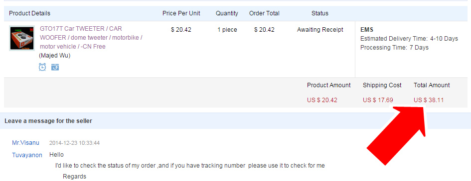 ก็เช็คไม่ได้ พูดง่ายๆก็คือว่า ถ้าเราเลือกการส่งฟรี มันเช็คสถานะไม่ได้ แล้วพอเราเลือกการส่งแบบ EMS มันก็เช็คสถานะไม่ได้เหมือนกัน ดังนั้น เราจะมาเสียเงินตั้ง 17.69 เหรียญ ( เพื่อเป็นการส่งแบบ EMS ) ทำไมล่ะครับ? ก็เลือกการส่งฟรี เสียตั้งแต่แรกเลยไม่ดีกว่าหรือ? ( อันนี้พูดแบบประชดนะครับ - คือการส่งของจีนมันสุดห่วยจริงๆ ) ทีมงานไม่ได้มีอคติอะไรกับการขนส่งของจีนนะครับ แต่ทีมงานพูดไปตามประสบการณ์ เพราะสั่งซื้อสินค้าให้ลูกค้ามาจะสิบปีแล้ว ก็เป็นอย่างนี้ทุกครั้ง จนมั่นใจแล้วถึงได้พูดว่าการขนส่ง EMS ของจีนมันแย่จริงๆ แล้วควรจะปฏิบัติตัวอย่างไร? คำตอบที่ทีมงานแนะนำมีสองทางเลือกนะครับ คือ ![]() ![]() แถมท้าย - มีอีกตัวอย่างหนึ่ง ที่แสดงให้เห็นถึงปัญหาที่เกิดจากการส่งสินค้าแบบ EMS ลองคลิ๊กไปอ่านดูที่ลิงค์นี้นะครับ http://www.tuvagroup.com/ercs-001001G-571229-0420.html |