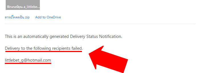 ( ภาพบน ) เมื่อทีมงานส่งเมลล์ไปหาคุณ littlebet_g@hotmail.com แล้ว ปรากฏว่าเมลล์มันตีกลับมา โดยมีเนื้อหาเมลล์เป็นไปตามที่เห็นในรูปข้างบนนี้ / คือมันบอกว่าผู้รับที่ชื่อ littlebet_g@hotmail.com ไม่สามารถรับเมลล์ได้ ( ตรงที่ ลูกศรสีแดง ชี้อยุ่ในภาพข้างบนนี้ )